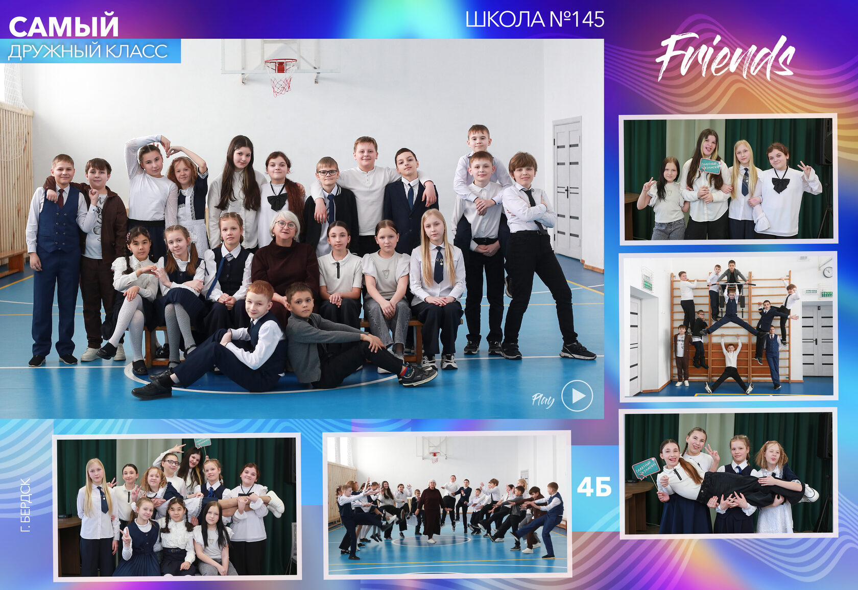 Эта фотография создается путём съемки нескольких кадров учеников в школе или на территории школы. Мы делаем одно основное совместное фото и 5 коллажных фото маленькими группами. Если хотите фотографироваться на улице, возможно потребуется дополнительная подготовка - вынести скамейки/стулья/парты в зависимости от количества учеников в классе (уточняйте заранее).